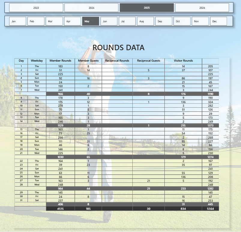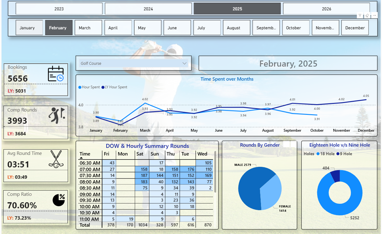 This dashboard enables golf course managers to monitor player activity, identify peak days, and optimize pricing or scheduling strategies based on data-driven insights.