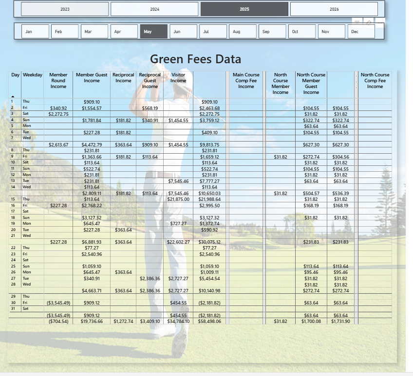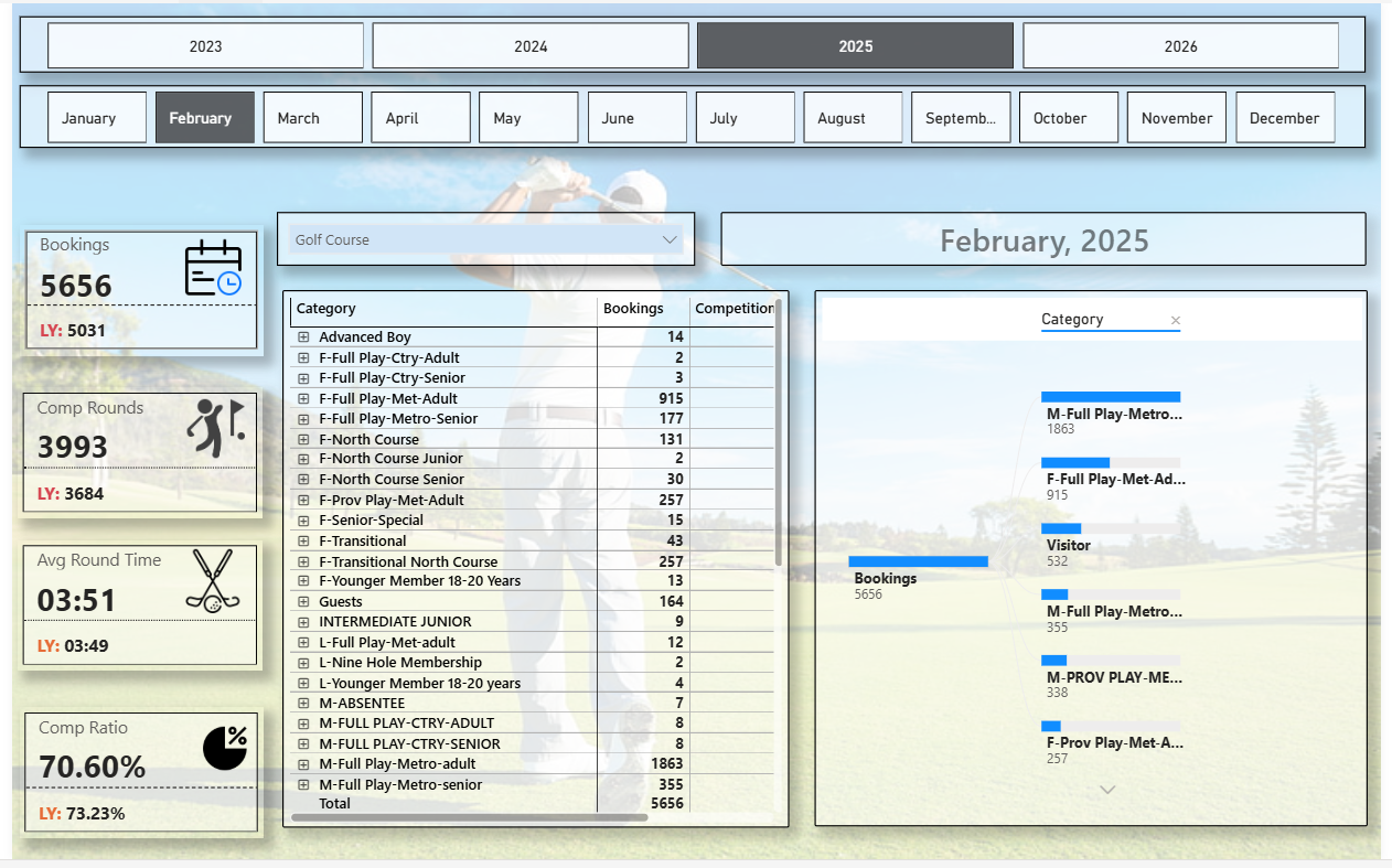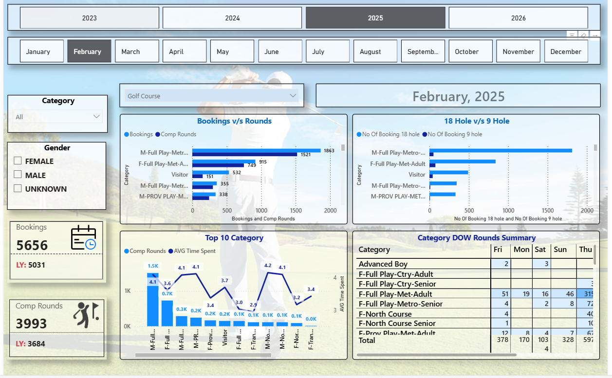 This dashboard delivers a powerful analytical interface for golf course management, allowing stakeholders to monitor trends, identify peak performance periods, and improve operational efficiency through data visualization.