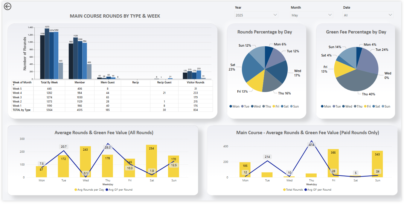 Rounds & Green Fee Percentages by Day: Shows which days of the week drive the highest play and revenue contribution.